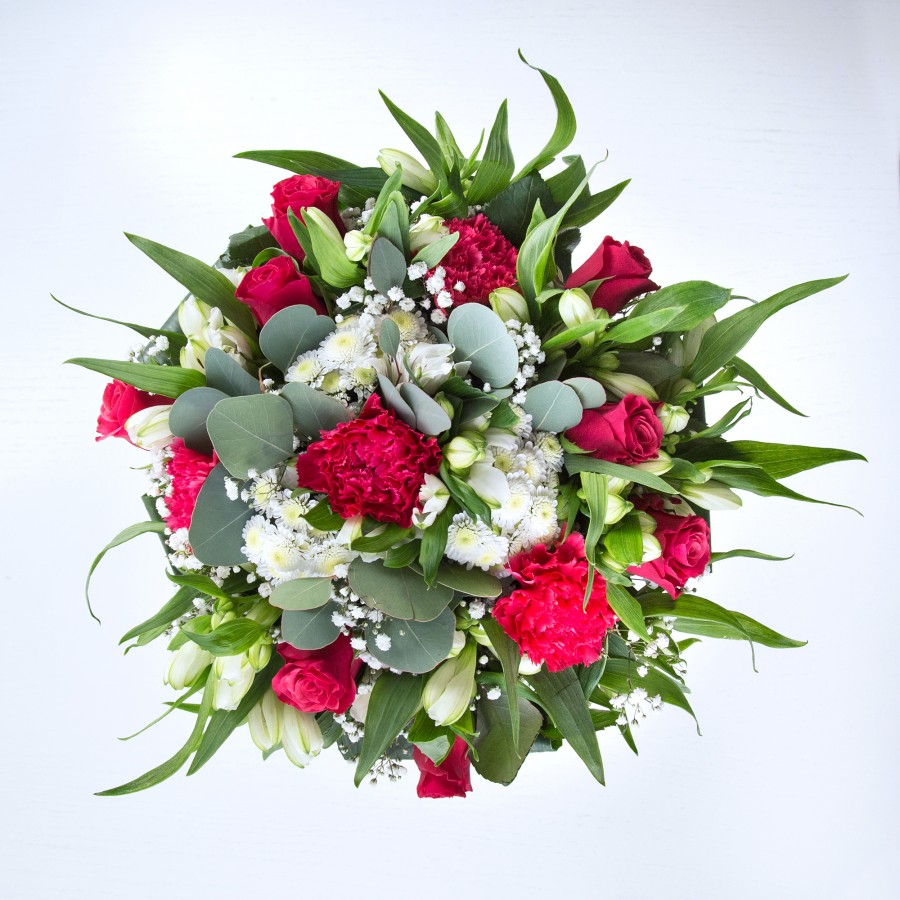 This bouquet will provoke your sense of creativity and imagination. Featuring sweet white chrysanthemums and gypsophila, luxurious red roses and carnations, delicately arranged with white alstroemeria and aspidistra leaves.